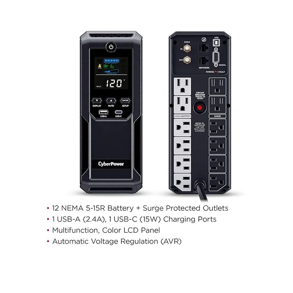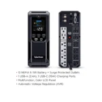 The CyberPower CP1500AVRLCD3 UPS delivers 1500VA/900W backup power with AVR, LCD monitoring, USB charging, and reliable Mini Tower protection for computers and home devices.